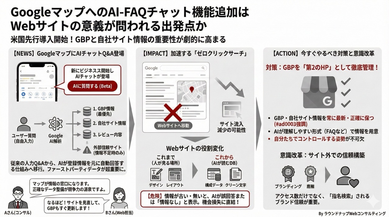 この記事では、GoogleマップのGoogleビジネスプロフィール(GBP)に「AIベースのQ&A(チャット)機能」が入り始めたという海外事例を手がかりに、これからの集客とWebサイトの役割をどう考えるかを整理します。