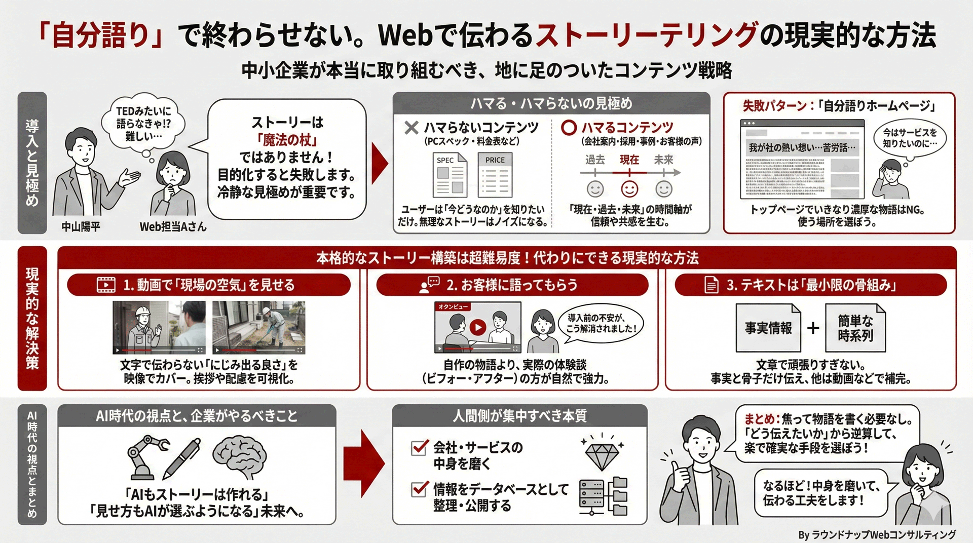 - 大事なのは「ストーリーテリングそのもの」ではなく、感情や記憶に残る伝え方をどう実現するかであり、その手段として動画・お客様の声・現場の見せ方など、もっと現実的な選択肢がたくさんある。