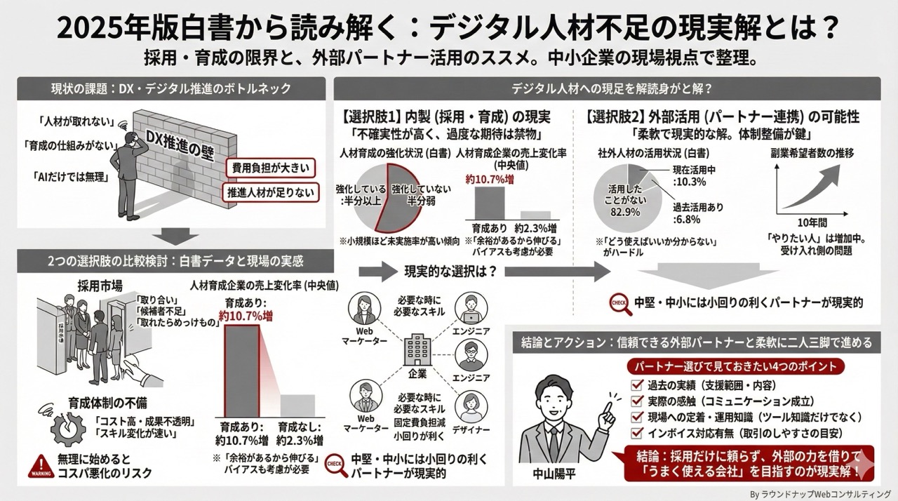2025年版の中小企業白書・小規模企業白書を踏まえ、デジタル領域の人材不足を「内製」と「外部活用」の観点で整理しました。