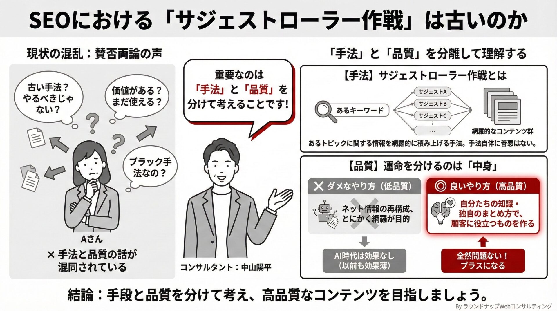 あるキーワードに対してGoogleが提示するサジェストワードを網羅してコンテンツを作る「サジェストローラー作戦」。これには賛否両論ありますが、あくまで手法の話であり、品質の話とは分けて考えるべきです。