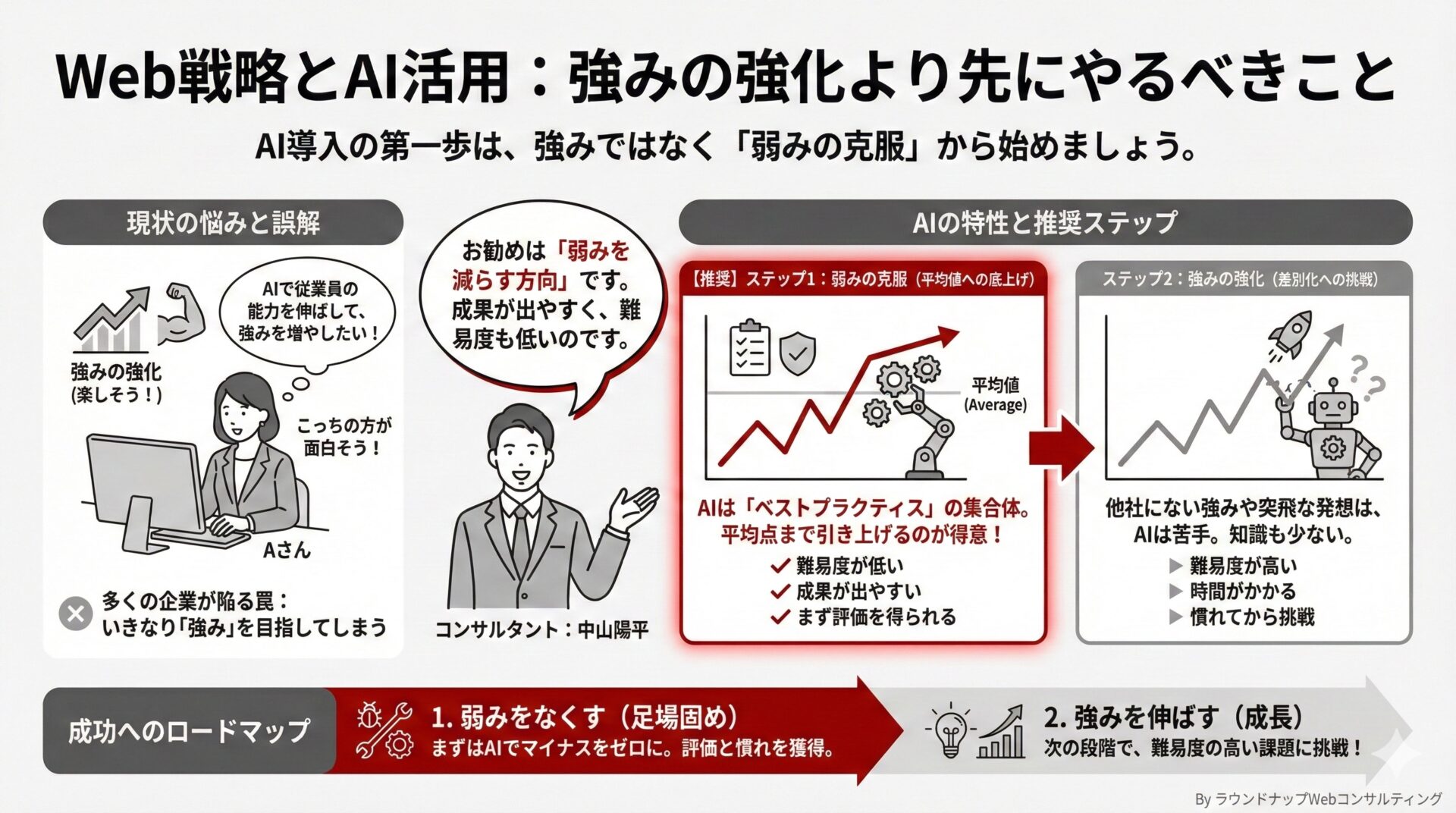 - AIは既存のベストプラクティスに基づき平均点まで引き上げることが得意なため、まずは「弱みの削減」や「業務の効率化」に活用することをお勧めします。独自の強みを伸ばすのは難易度が高いため、まずは弱みを減らすことから始めて成功体験を積むのが良いでしょう。