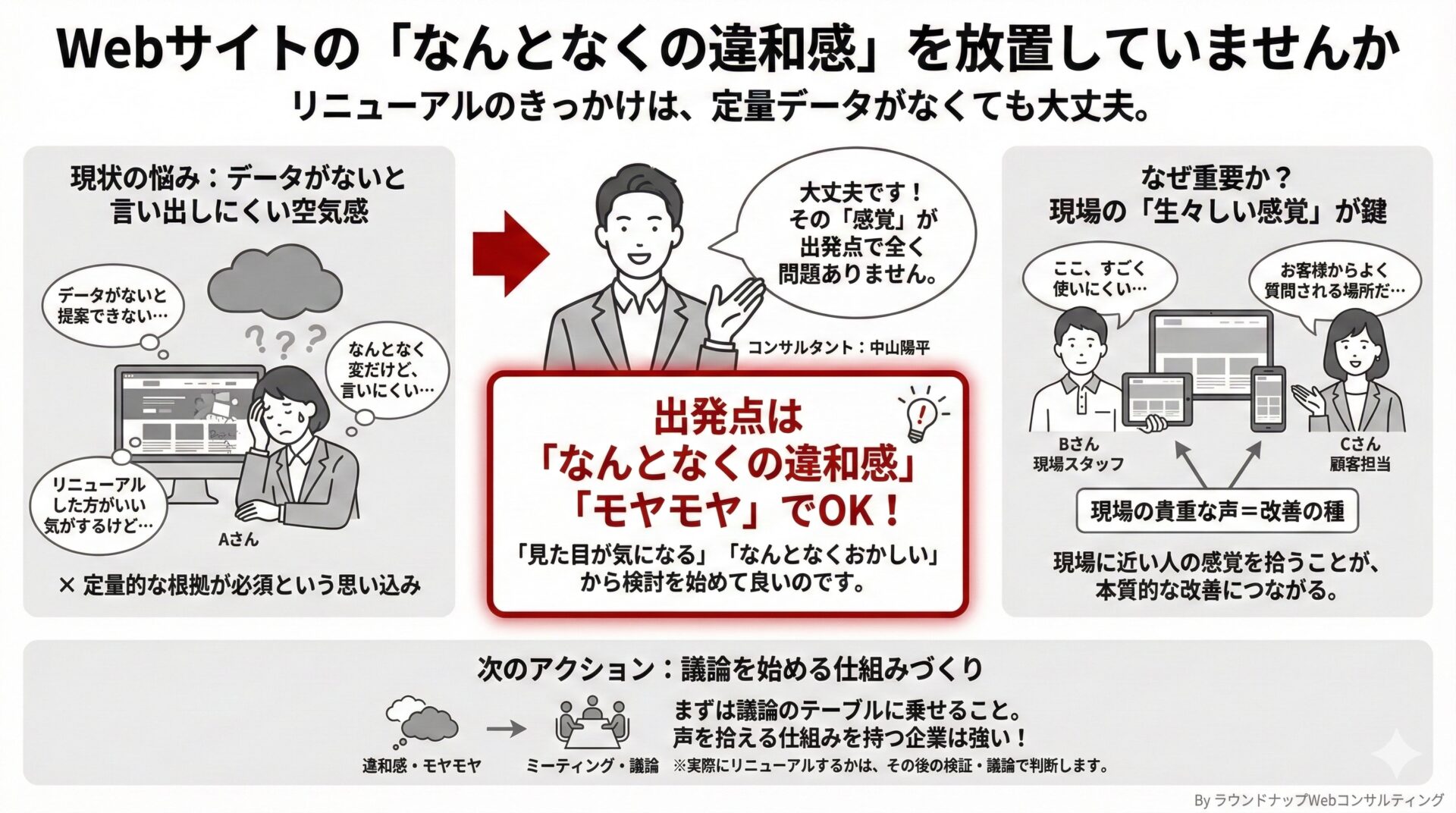 Webサイトに対して感じる定性的なモヤモヤや、「なんとなくおかしい」という感覚。そこから議論を始めても全く問題ありません。
