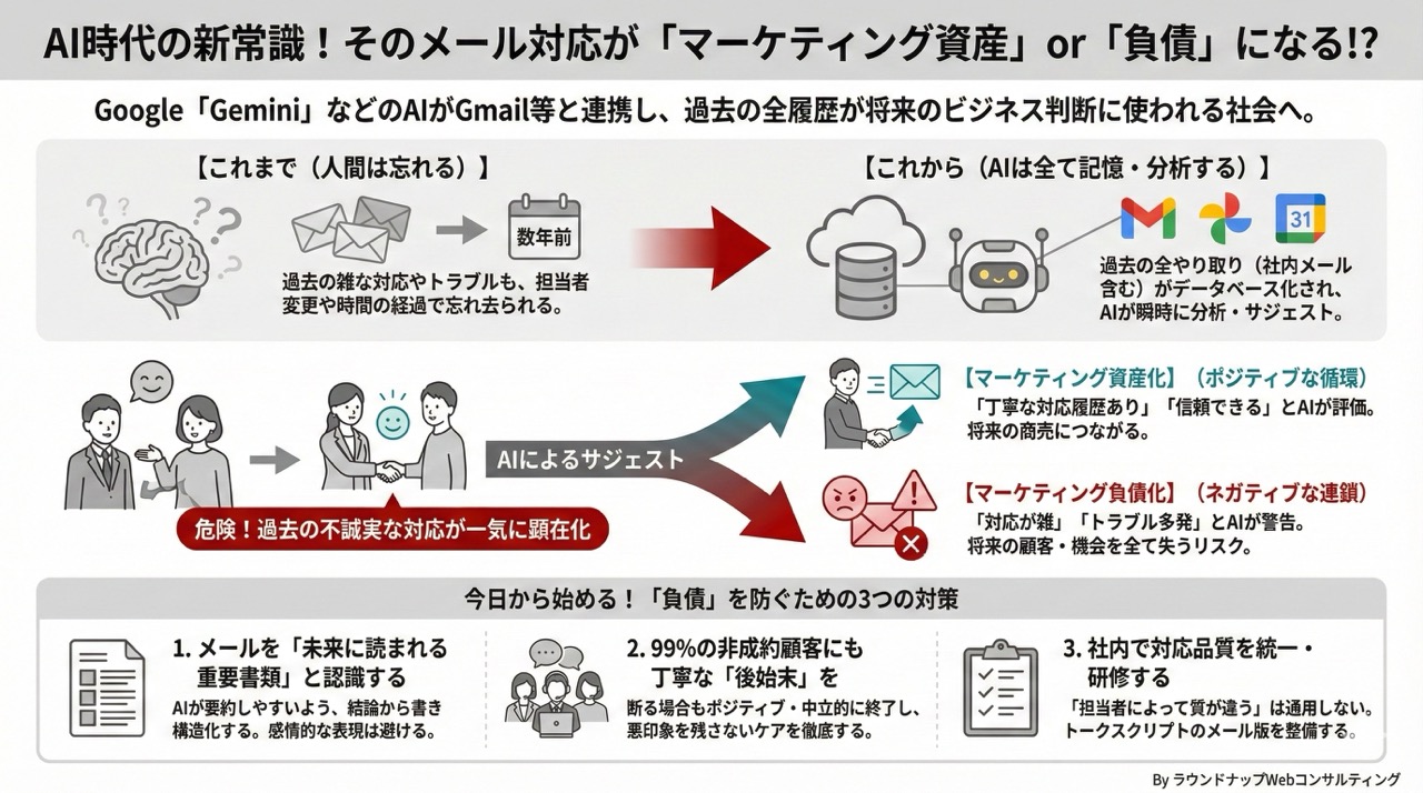- 人間は忘れますが、AIは忘れません。過去の営業メールや対応履歴が整理され、将来の検討タイミングで一気に参照されると、当時の雑さがそのまま判断に影響します。