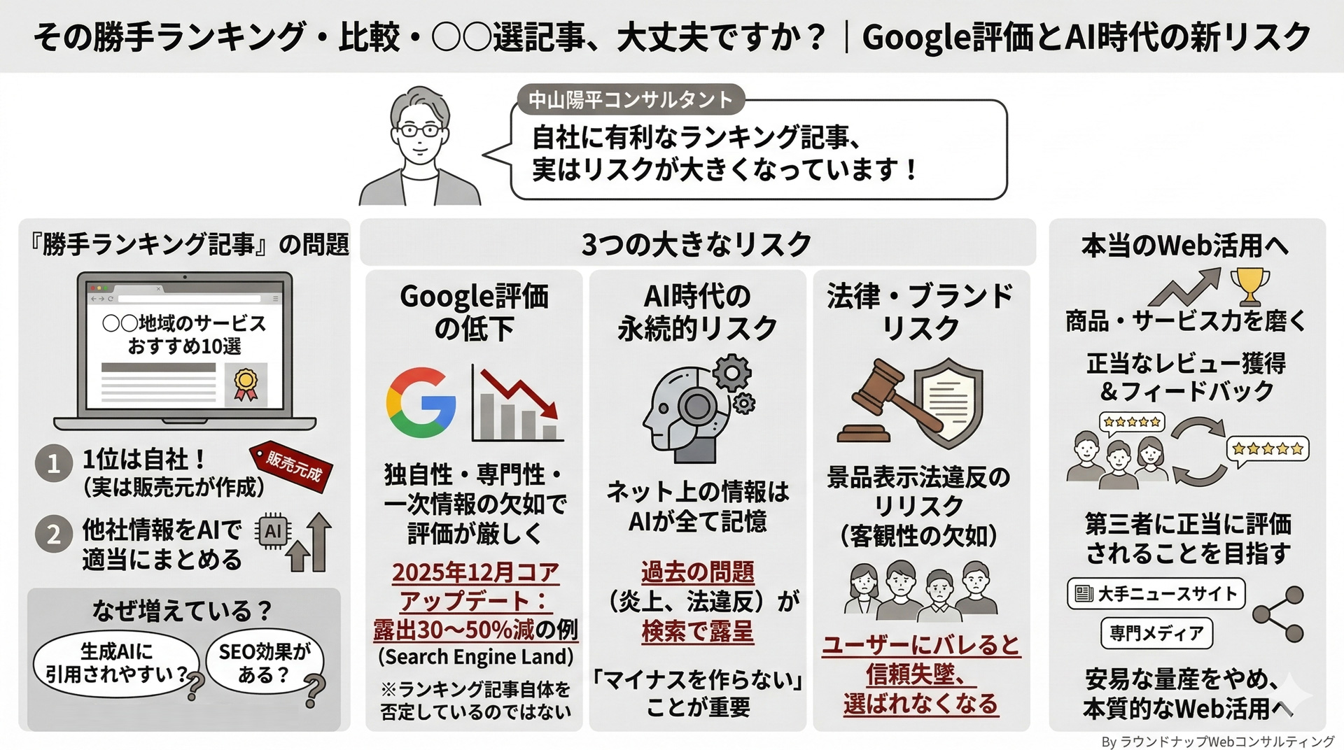 ラウンドナップWebコンサルティングの中山陽平です。今回は、勝手ランキングや比較記事、○○選記事のようなセルフプロモート型のページが、なぜ今あらためて見直しの対象になっているのかを、現場で見えてきた変化とあわせてお伝えします。