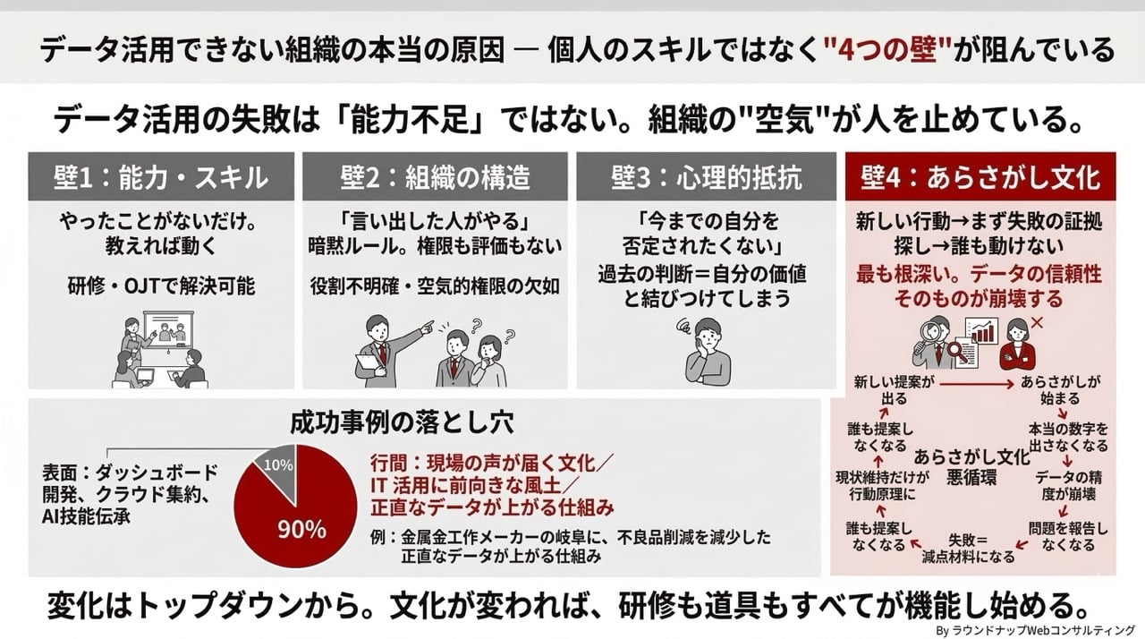 データ活用というと、どうしても算数や数学的なイメージがつきまとい、うまくいかない原因を「リテラシー不足」「意識が低い」「主体性がない」といった個人の課題に集約しがちに感じます。
