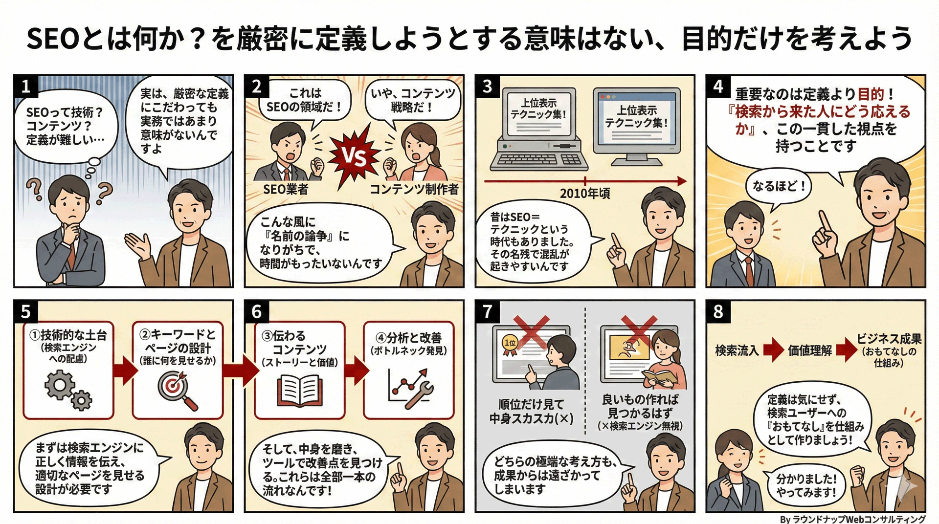 - A1. きっちりした定義を決めること自体は、実務ではあまり役に立ちません。むしろ、「検索から来た人にどう応えるか」という視点で、必要なことを一つの流れとして考える方が現実的です。