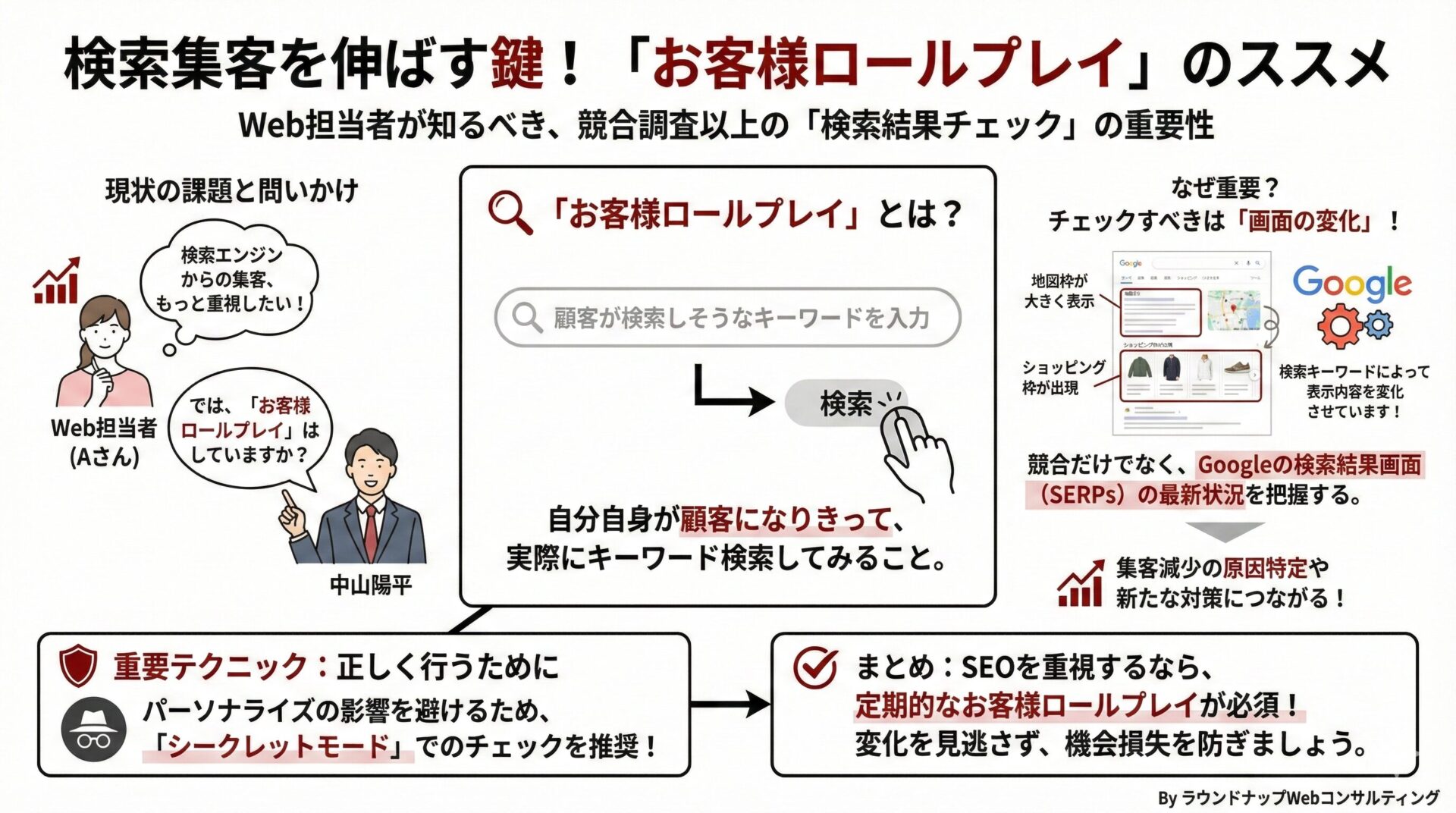 検索エンジンからの集客を重視するなら、実際にお客様が使いそうなキーワードで自分でも検索し、検索結果画面や競合の状況、Google検索結果の変化をシークレットモードで定期的に確認する「お客様ロールプレイ」を行うことが大切です。