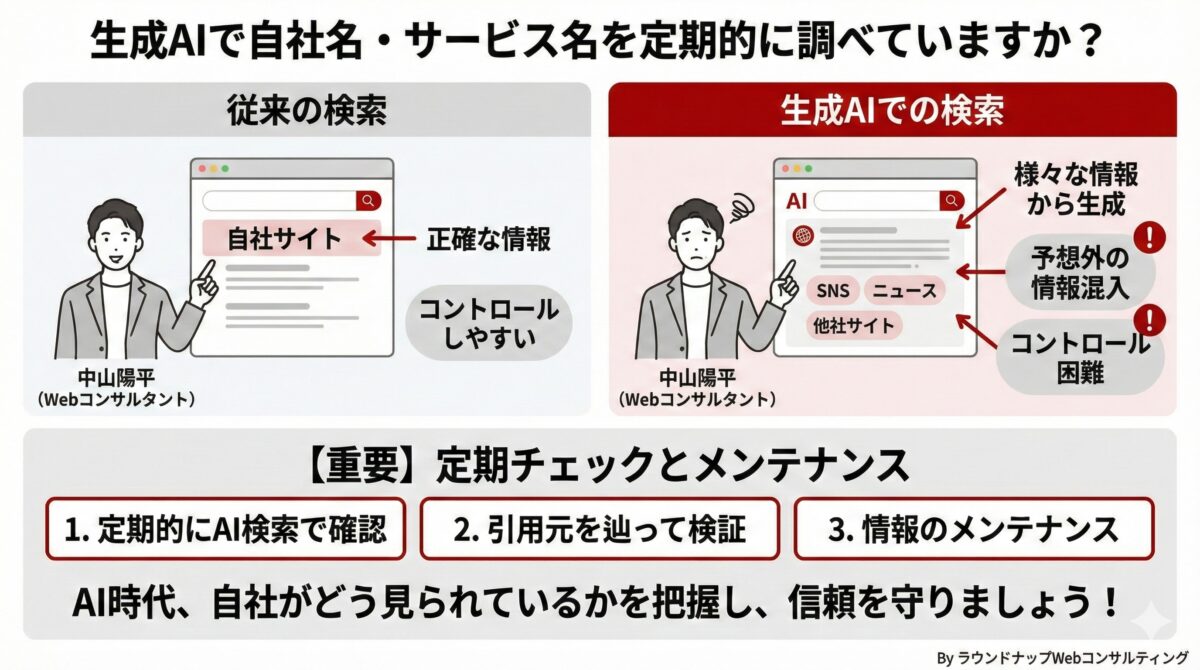はい、生成AIが検索に組み込まれている今は、自社名やサービス名を定期的に調べることが大事だと話されています。従来の検索であれば自社サイトが上位に出てきやすく、そこから正しい情報を拾ってもらえるため、誤解は比較的少なく済んでいました。しかし生成AIの場合、SNSやニュース、他社サイトなどさまざまな情報を元に回答が作られます。そのため、予想外の内容が混ざるなど、自分たちではコントロールしづらい状況になっています。\n\nだからこそ、自社がAIにどう見られているのかを定期的にチェックし、必要に応じて引用元をたどって確認したり、情報をメンテナンスすることが重要だと説明されています。