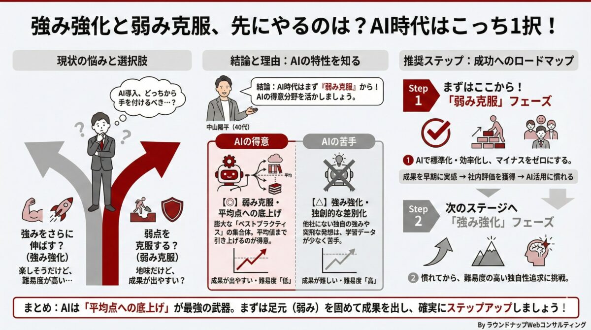 AIを導入する際に、「強みを伸ばす」よりも「弱みを減らす」使い方を先にやったほうが、難易度が低く成果も出やすい理由と、その優先順位の考え方が分かります。