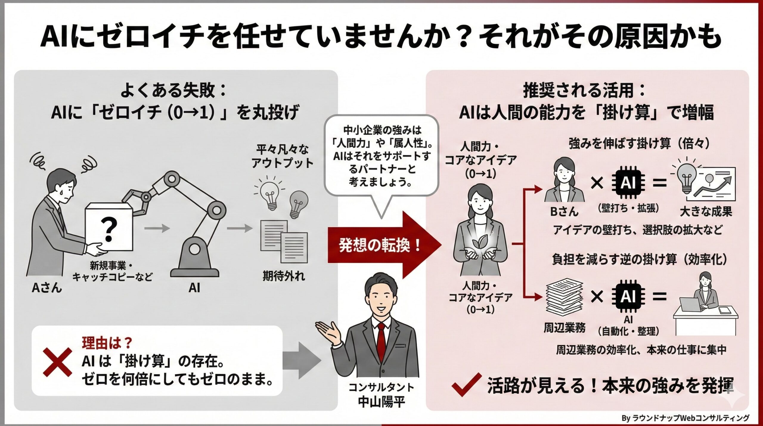 中小企業でAIを導入しているのですが、新規事業のアイデア出しやキャッチコピー作成などを、最初から全部AIにやらせてもピンとくる成果が出ていません。AIにゼロから1を任せようとするやり方に問題があるのでしょうか?