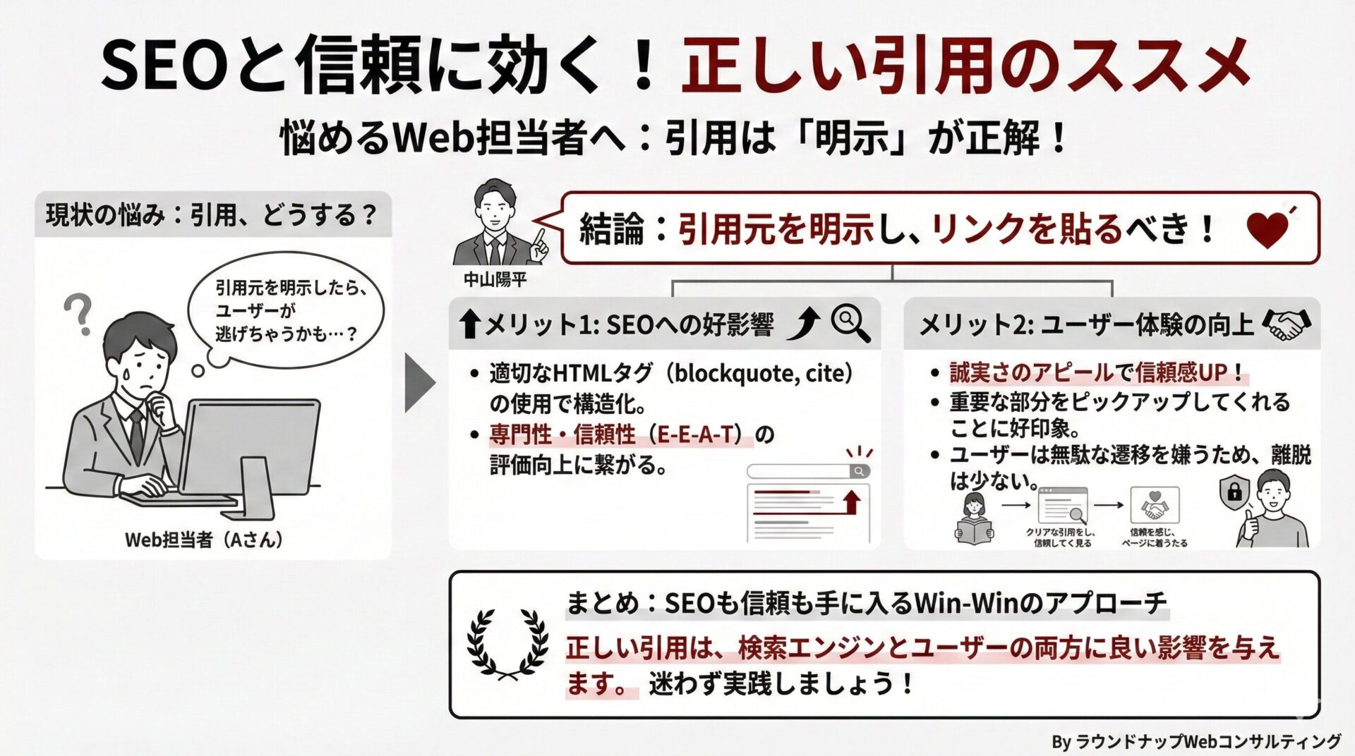 むしろ、引用によって重要な部分だけをピックアップしてくれていること、そしてそれを自分たちのコンテンツとしてではなく「元はここですよ」と示してくれている、その誠実さのほうが、ユーザーさんに良い印象を与えます。
