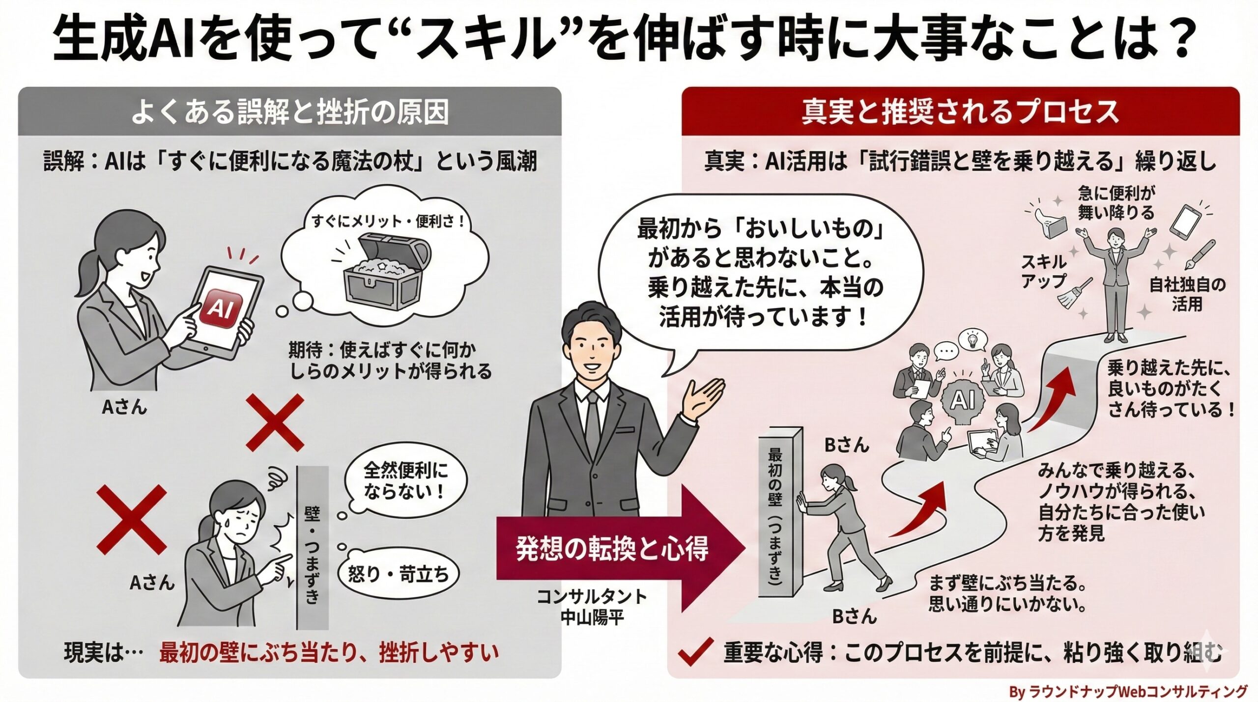 生成AIでスキルを伸ばすには、「最初からすぐ便利になる」と期待しすぎず、必ず最初にいくつかの壁やモヤモヤがあり、それを工夫して乗り越えた先に自社に合った活用方法やノウハウが見えてくるものだと心得ておいてください。その上で、「いくつかの壁を超えた先に良いものが待っている」という心構えを持つことが、挫折せずAI活用を続けるポイントになります。