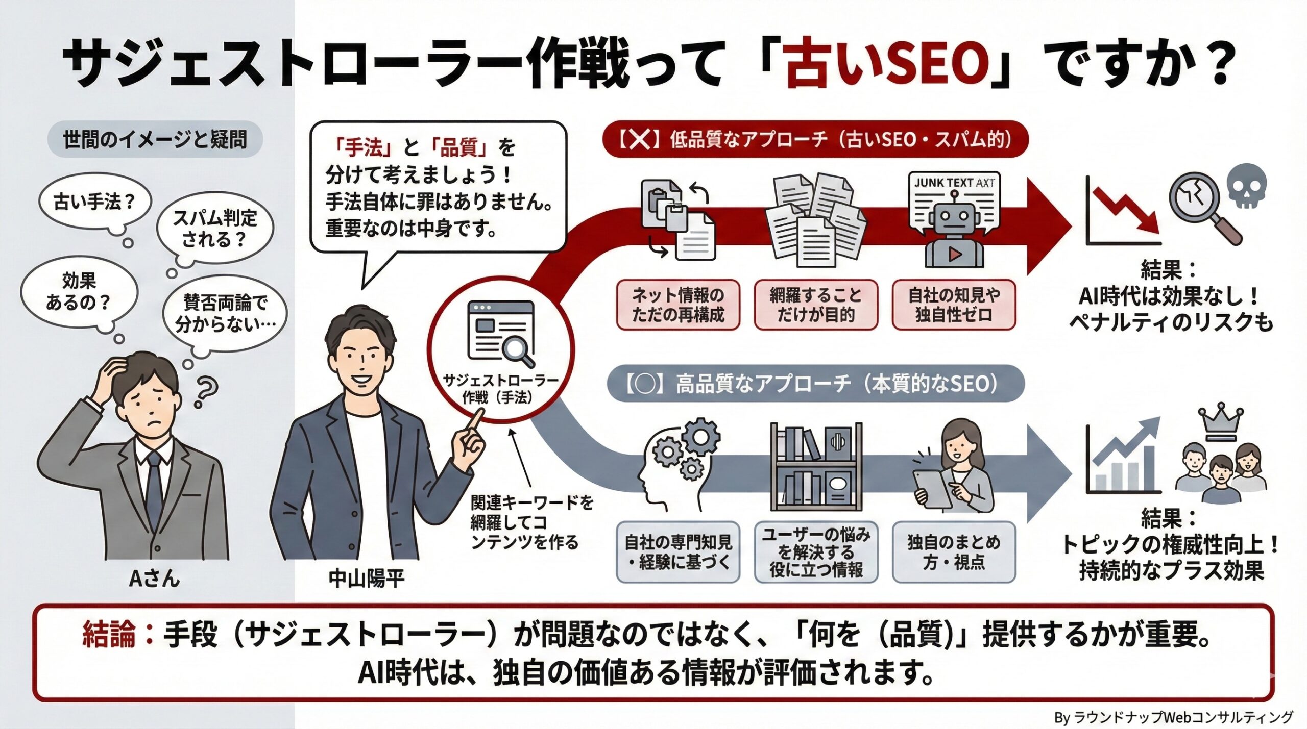 サジェストローラー作戦は、本来はGoogleサジェストを網羅してコンテンツを作る「手法」にすぎず、問題はその手法で低品質なコンテンツを量産することにある、という整理が分かります。手段と品質を分けて考えることで、「古いSEOかどうか」の判断軸が整理できます。