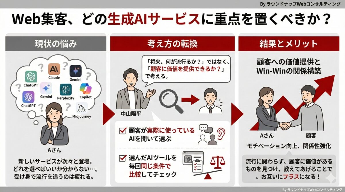 生成AIサービスが乱立する中で、Web集客のためにどのサービスに重点を置いて自社の扱われ方をチェックすべきか、その考え方の軸が分かります。お客さんにとって価値があるAIに絞り込むという、選び方の視点が整理できます。