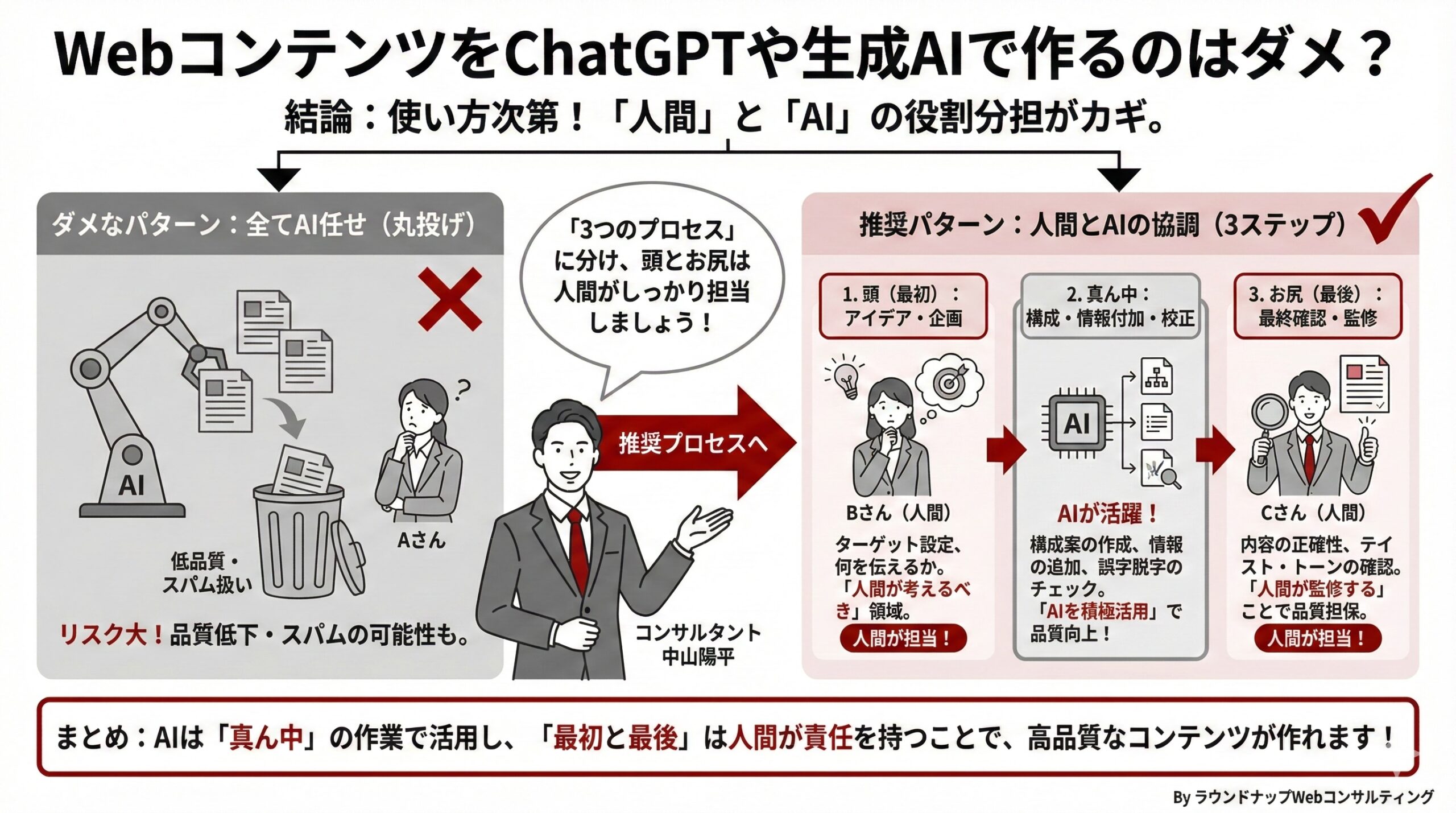 Webコンテンツ制作を「最初(企画)」「真ん中(構成・改善・校正)」「最後(監修)」の3つに分け、企画と最終チェックは人間が担当し、その間の作業に生成AIを活用すると品質を保ちやすい、という使い方の考え方が分かります。